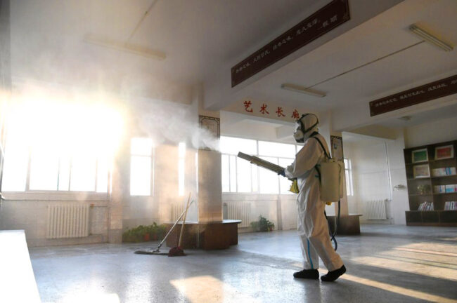 (แฟ้มภาพซินหัว : เจ้าหน้าที่กู้ภัยพ่นยาฆ่าเชื้อที่โรงเร…